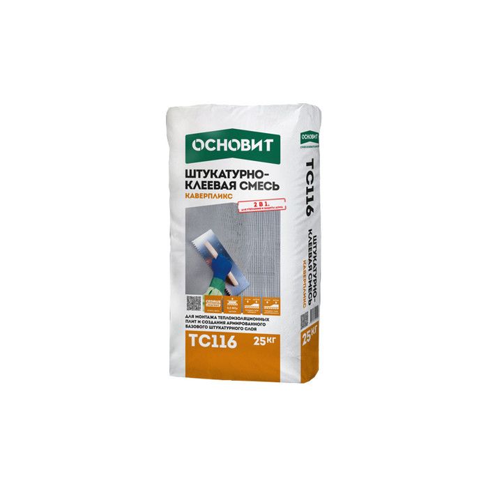 Штукатурно-клеевая смесь ОСНОВИТ КАВЕРПЛИКС ТС116 предназначена для монтажа пенополистирольных и минераловатных плит, создания армированного базового штукатурного слоя. Рекомендуется для создания “дышащих” систем утепления фасадов как новых, так и старых зданий. Применяется при устройстве системы фасадной теплоизоляции ОСНОВИТ. Для внутренних и наружных работ.